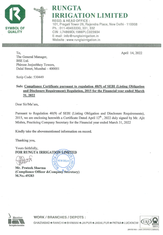 Regulation-40(9) Certificate-31-03-2022